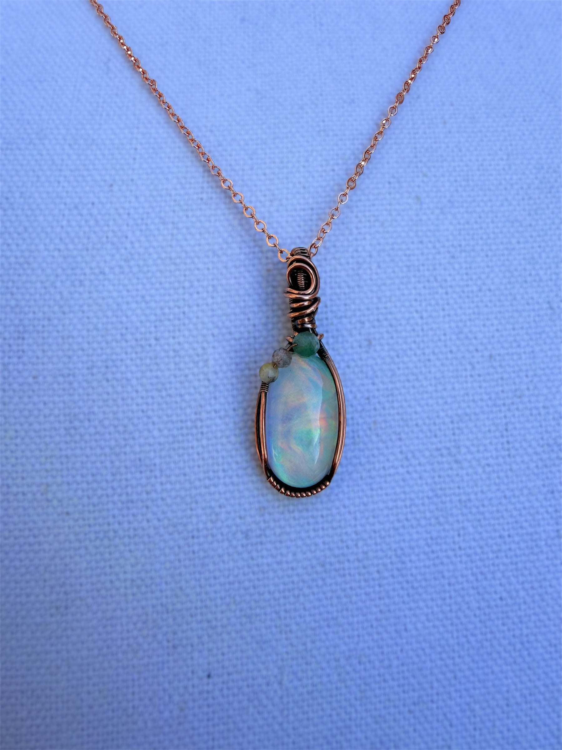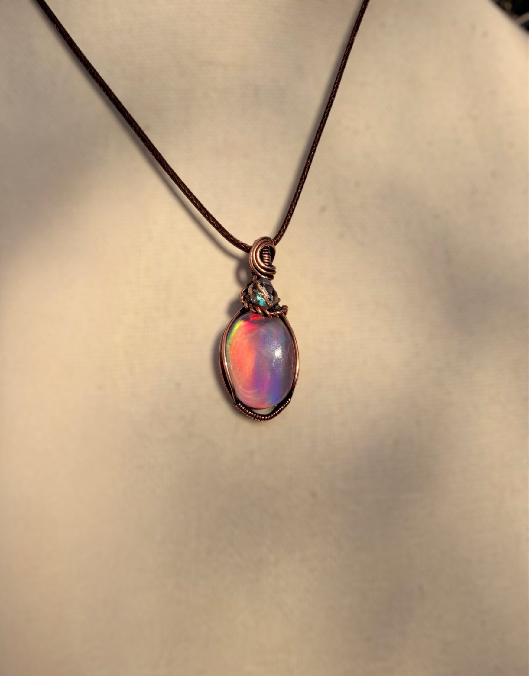 A glowing aura opal doublet wrapped in patina copper, crowned with a faceted rose gold bead for a touch of warmth and feminine radiance.