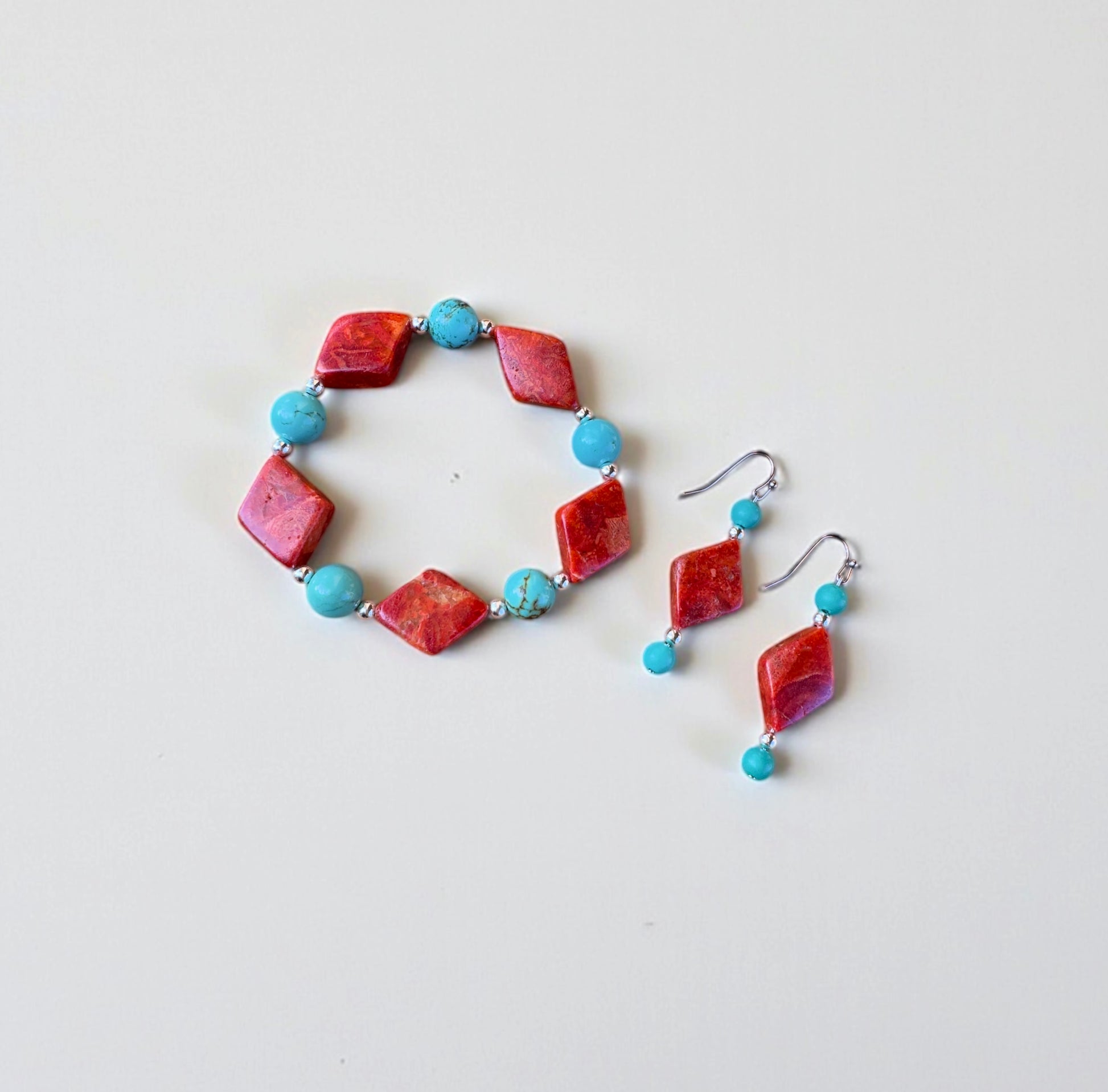 Handcrafted with 10–13mm genuine coral and turquoise stones, this set captures the essence of earth’s elements in perfect harmony. The bracelet features alternating red coral and turquoise beads accented with non-tarnished silver details, while the matching earrings highlight diamond-shaped coral pieces paired with 6mm turquoise beads and surgical steel hooks for lasting comfort.