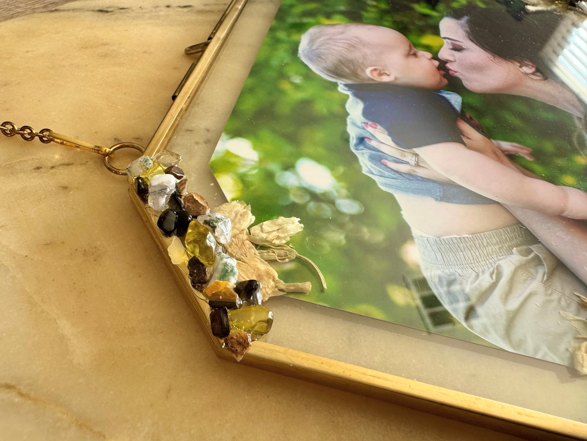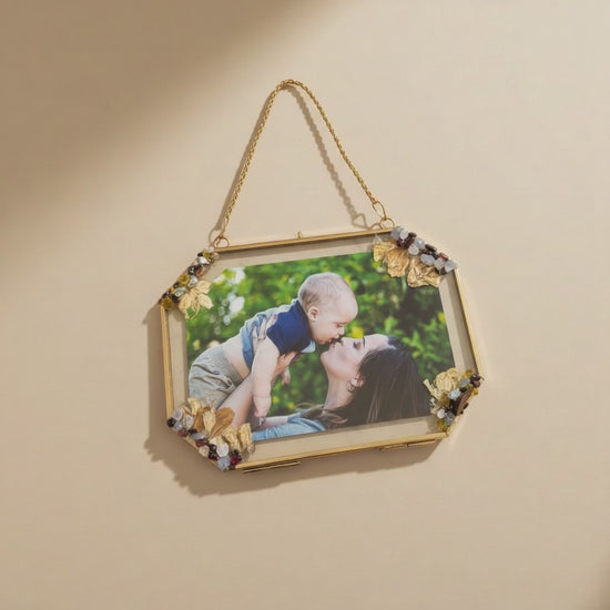 These elegant 5x7 gold glass frames turn your favorite photo into a meaningful keepsake. You’ll send me the picture you want to use (4x6 or smaller), and I’ll personalize the frame with birth flowers and assigned gemstones based on whoever is in the photo.