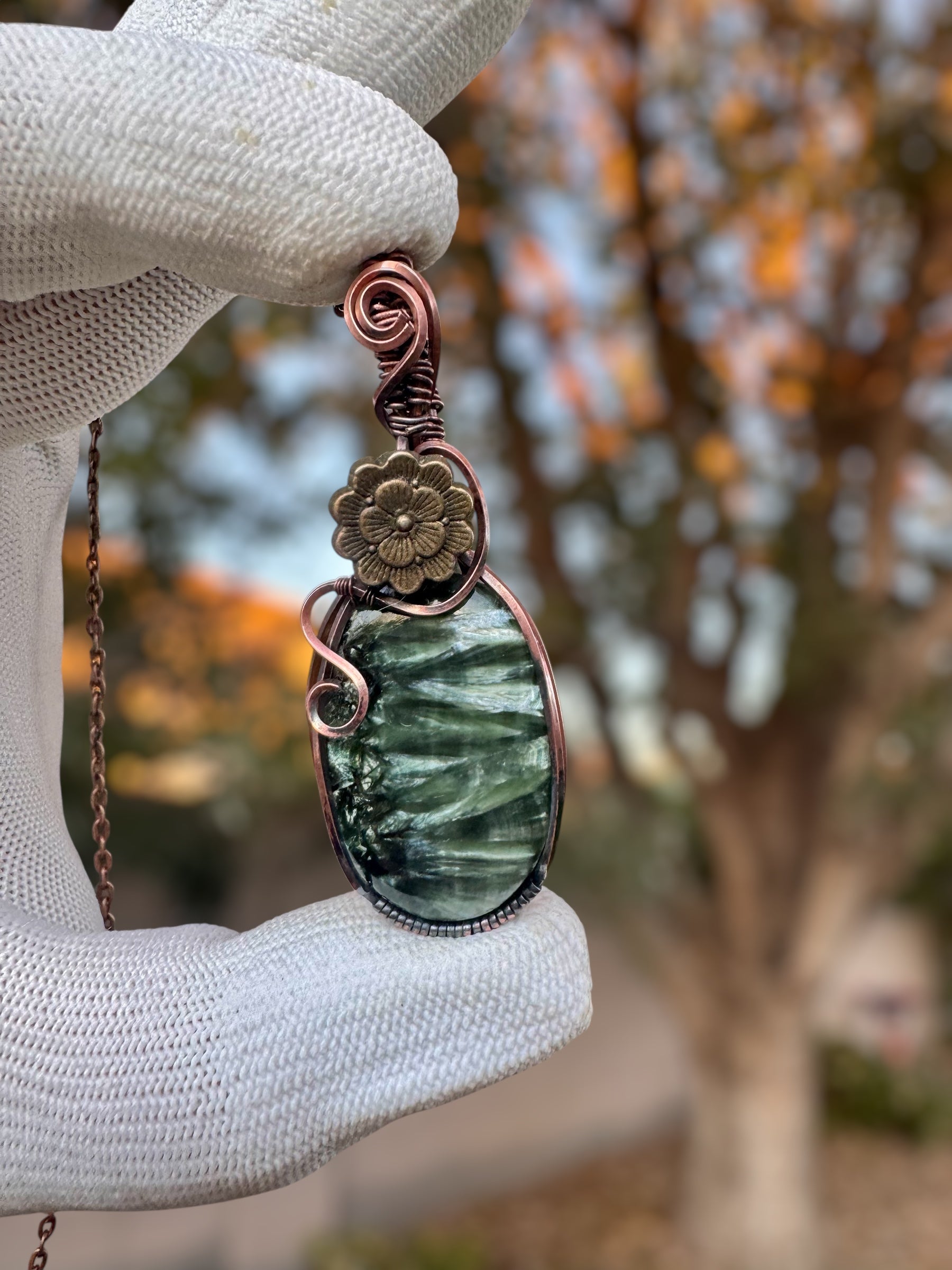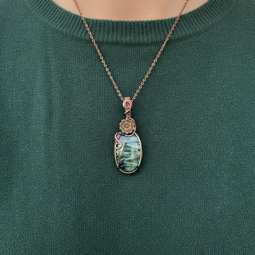 The flowing copper wire becomes a vine, extending from the antique - tone flower above, as if the piece is still growing. Still unfolding. Nothing rushed. Nothing forced