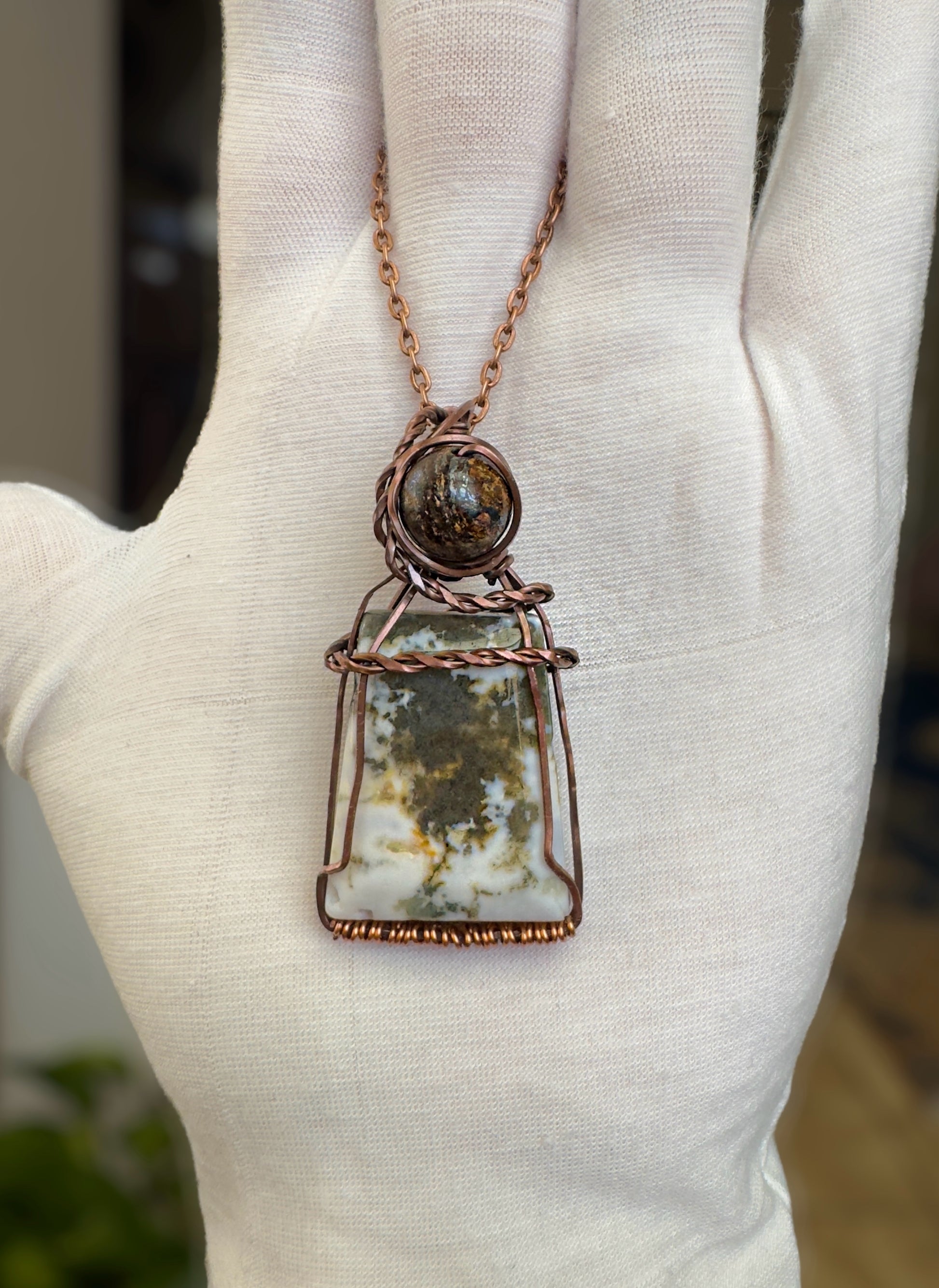 Finding Your Roots is a wearable journey back to self. This one-of-a-kind, wire-wrapped pendant features a bold Moss Agate paired with grounding Bronzite, wrapped in a twisted, hammered copper with a soft patina for a rustic, earthy finish.