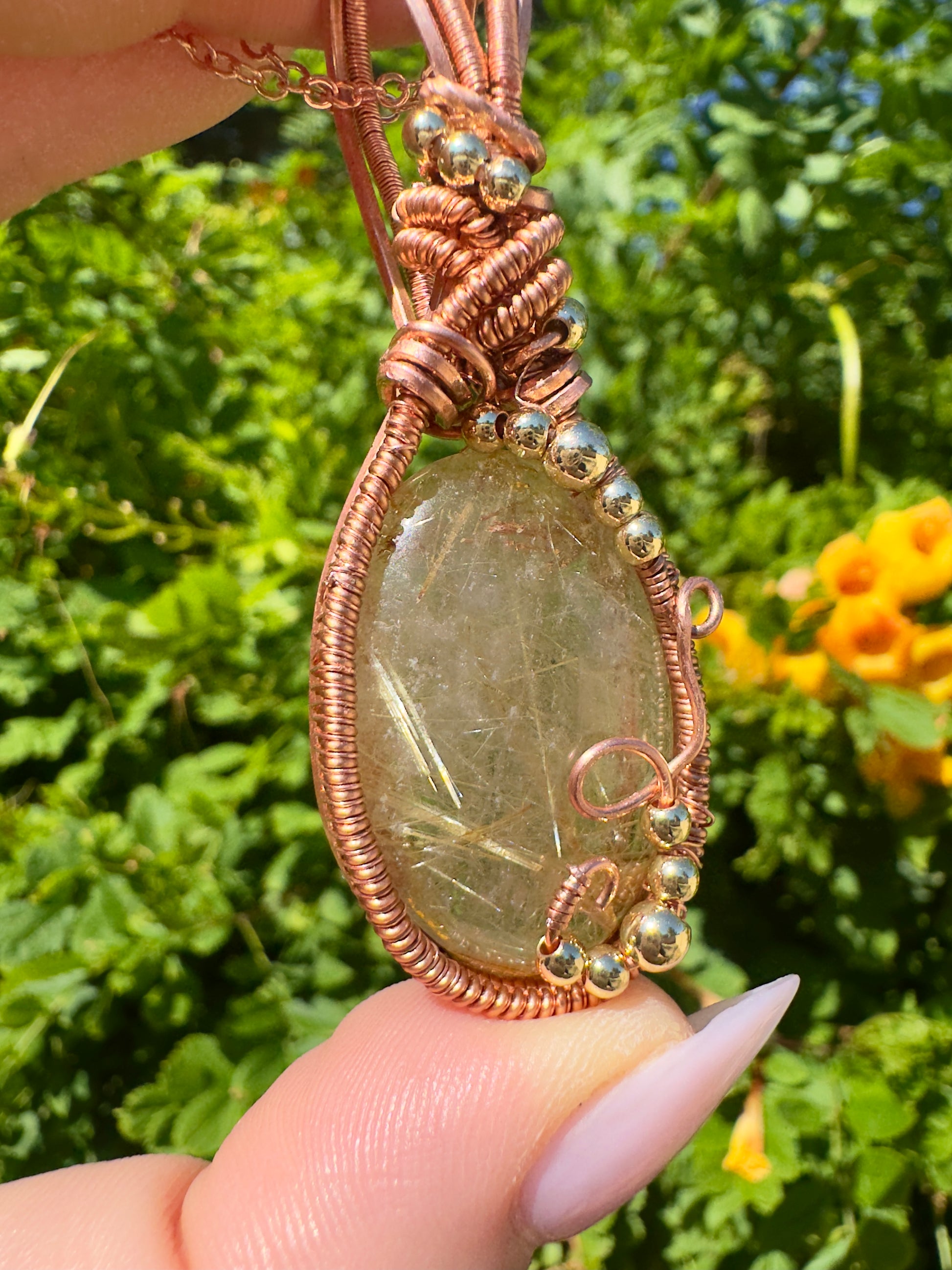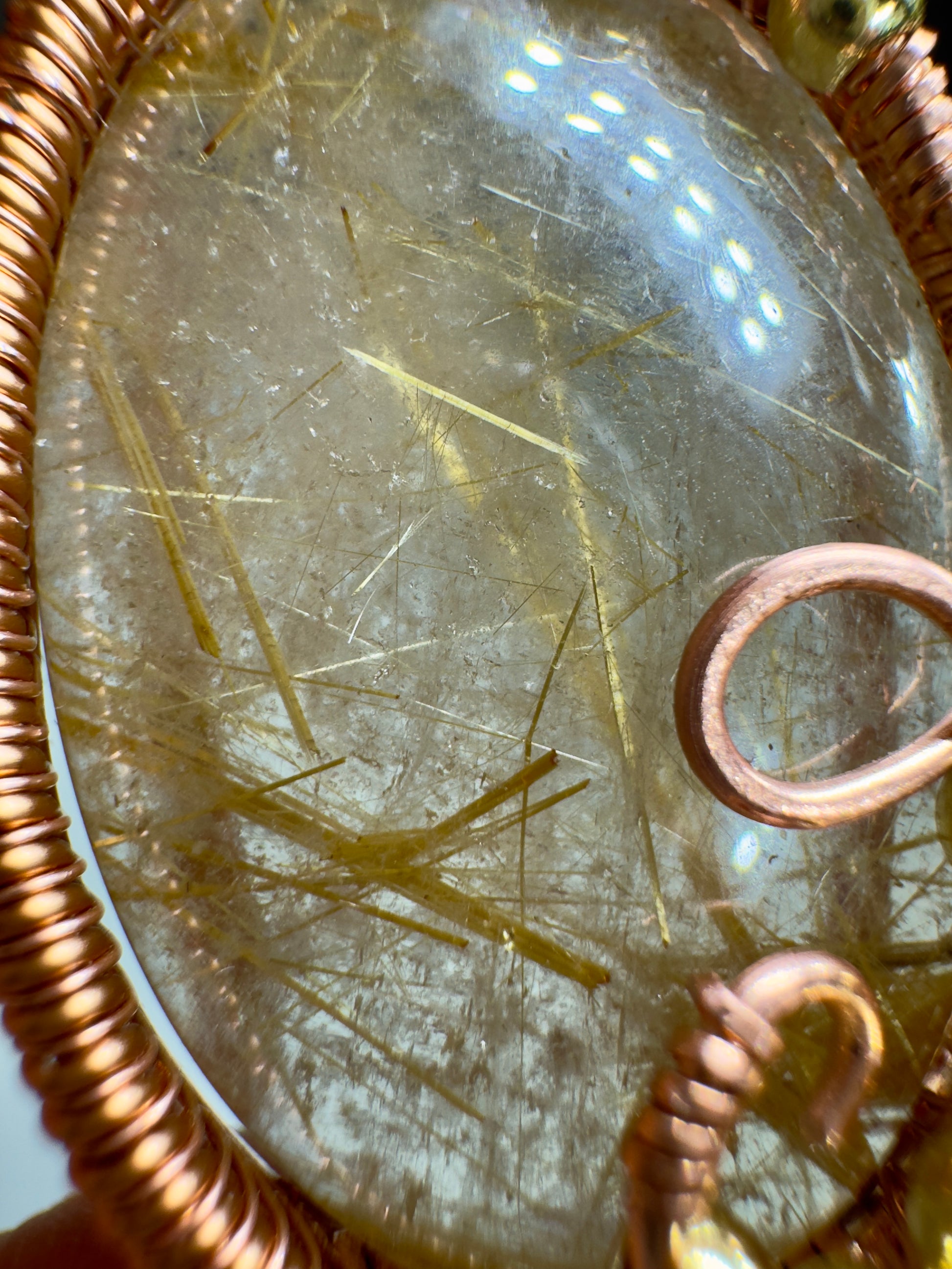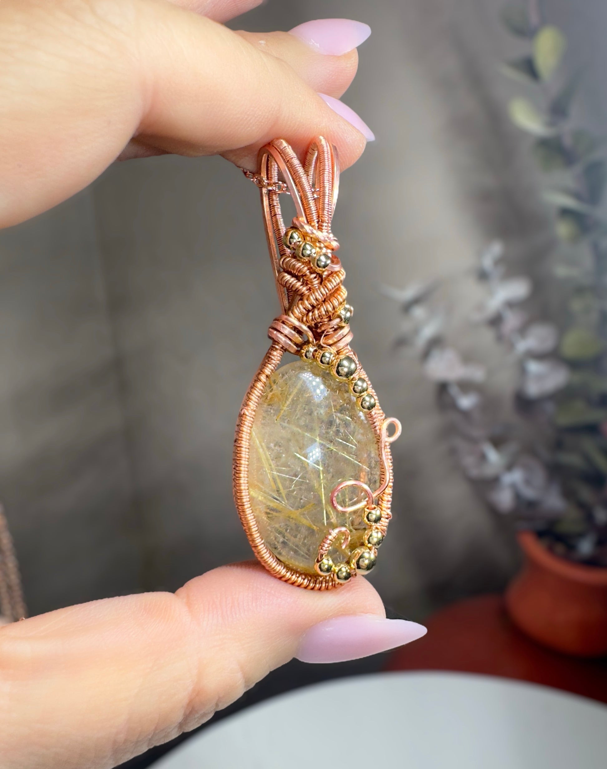 Golden Hour is inspired by that magical moment when the sun begins to set and the rays create a soft, golden wash across the world. It is that feeling when warm light gently kisses your face and you pause to bask in a glow that feels like it’s radiating from within you. This pendant features gold rutilated quartz wrapped in hand-shaped copper with 14k gold-filled accents that reflect the glow of late sunlight. The golden threads within the stone resemble sunbeams suspended in time, while the copper flow represents movement and transition.