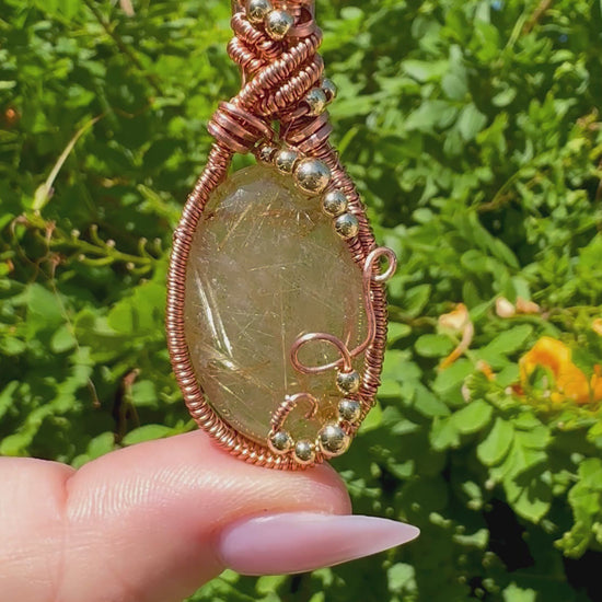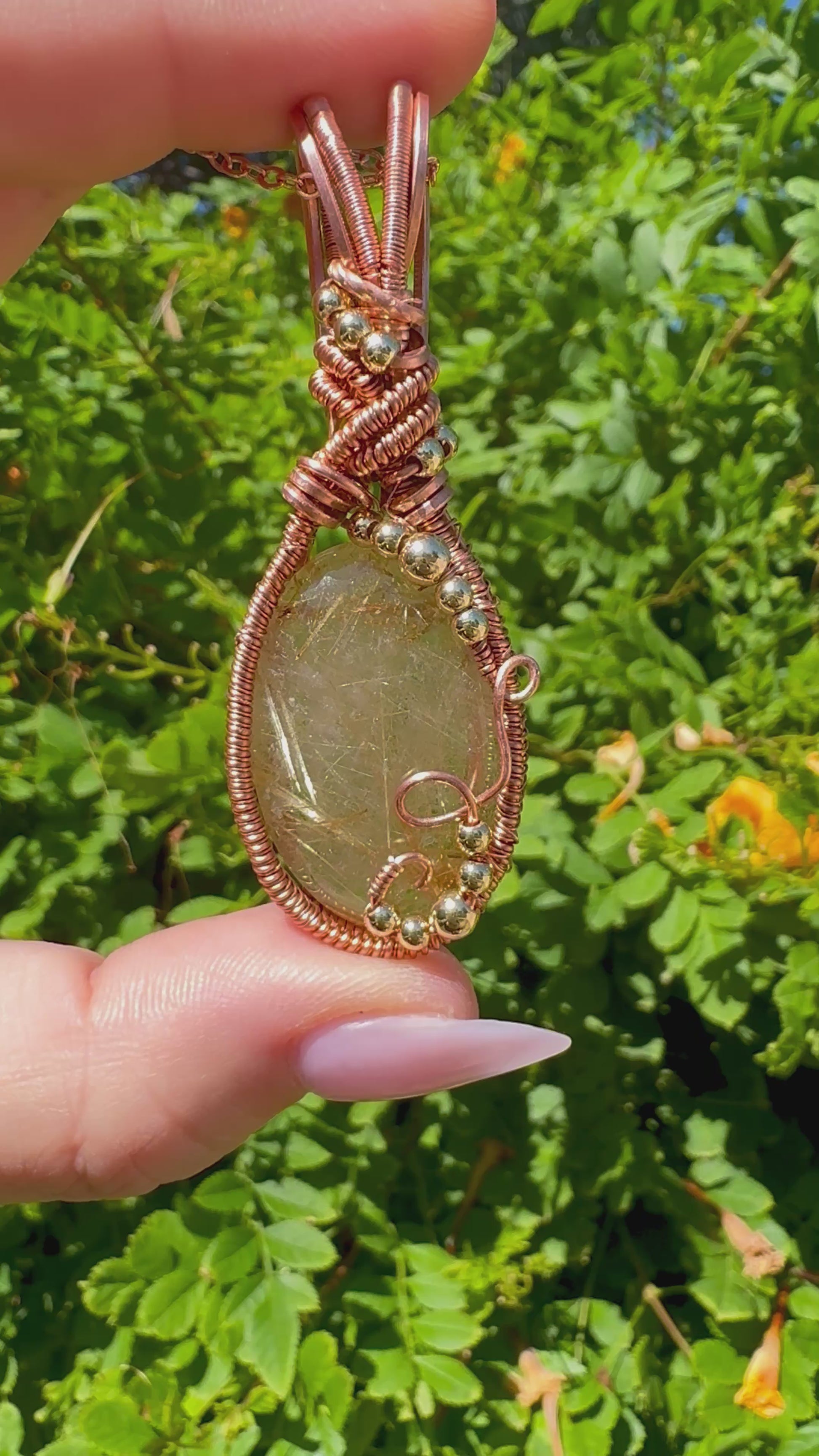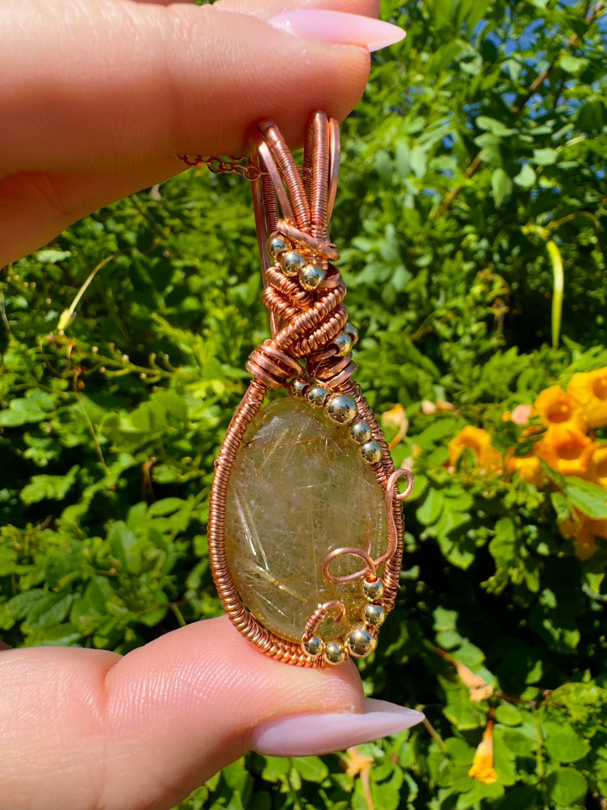 Golden Hour is inspired by that magical moment when the sun begins to set and the rays create a soft, golden wash across the world. It is that feeling when warm light gently kisses your face and you pause to bask in a glow that feels like it’s radiating from within you. This pendant features gold rutilated quartz wrapped in hand-shaped copper with 14k gold-filled accents that reflect the glow of late sunlight. The golden threads within the stone resemble sunbeams suspended in time, while the copper flow represents movement and transition.