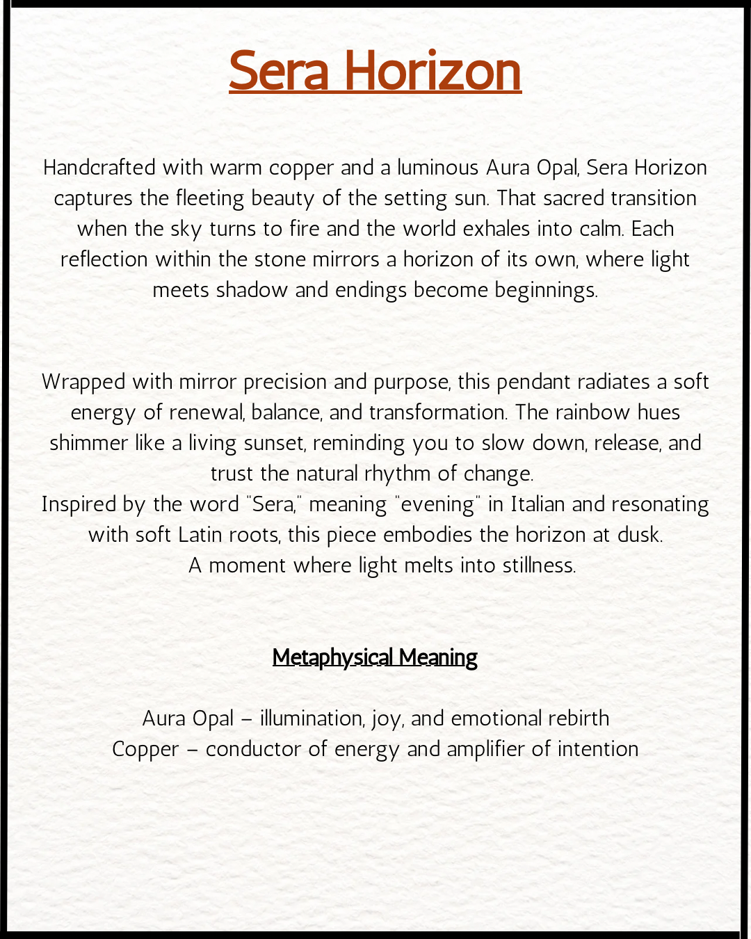 Handcrafted with warm copper and a luminous Aura Opal, Sera Horizon captures the fleeting beauty of the setting sun. That sacred transition when the sky turns to fire and the world exhales into calm. Each reflection within the stone mirrors a horizon of its own, where light meets shadow and endings become beginnings.