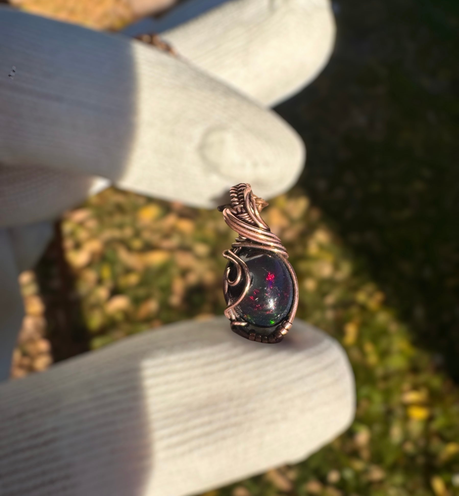 This micro pendant features a Smoked Ethiopian Opal, alive with flashes of red and green fire, wrapped in hand-patinaed copper. From a distance it appears dark and quiet, but when light touches it, hidden colors awaken. Just like your inner world, there is more beneath the surface than what first meets the eye.