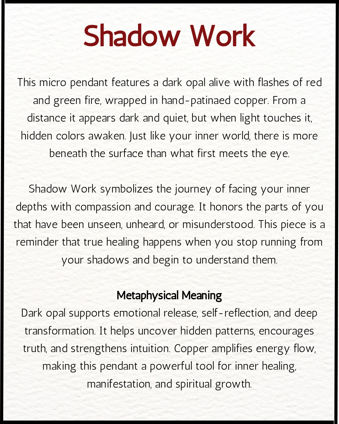 Smoked Ethiopian opal is believed to support emotional release, self-reflection, and deep transformation. It helps uncover hidden patterns, encourages truth, and strengthens intuition. Copper amplifies energy flow, making this pendant a powerful tool for inner healing, manifestation, and spiritual growth.