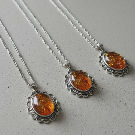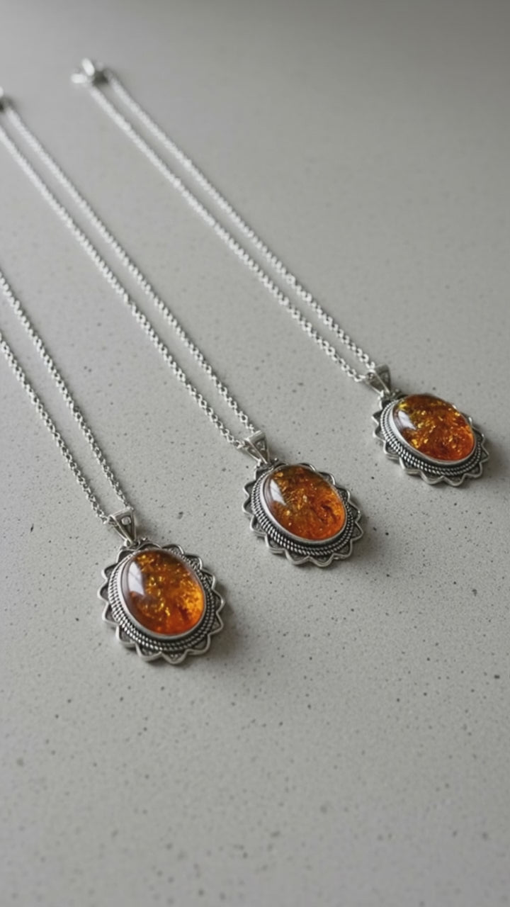 Handcrafted with crushed Amber and silver sun detailing, this pendant glows with the golden warmth of the Sun and the cool reflection of starlight. Amber embodies ancient wisdom and healing, while silver mirrors truth, intuition, and divine connection.