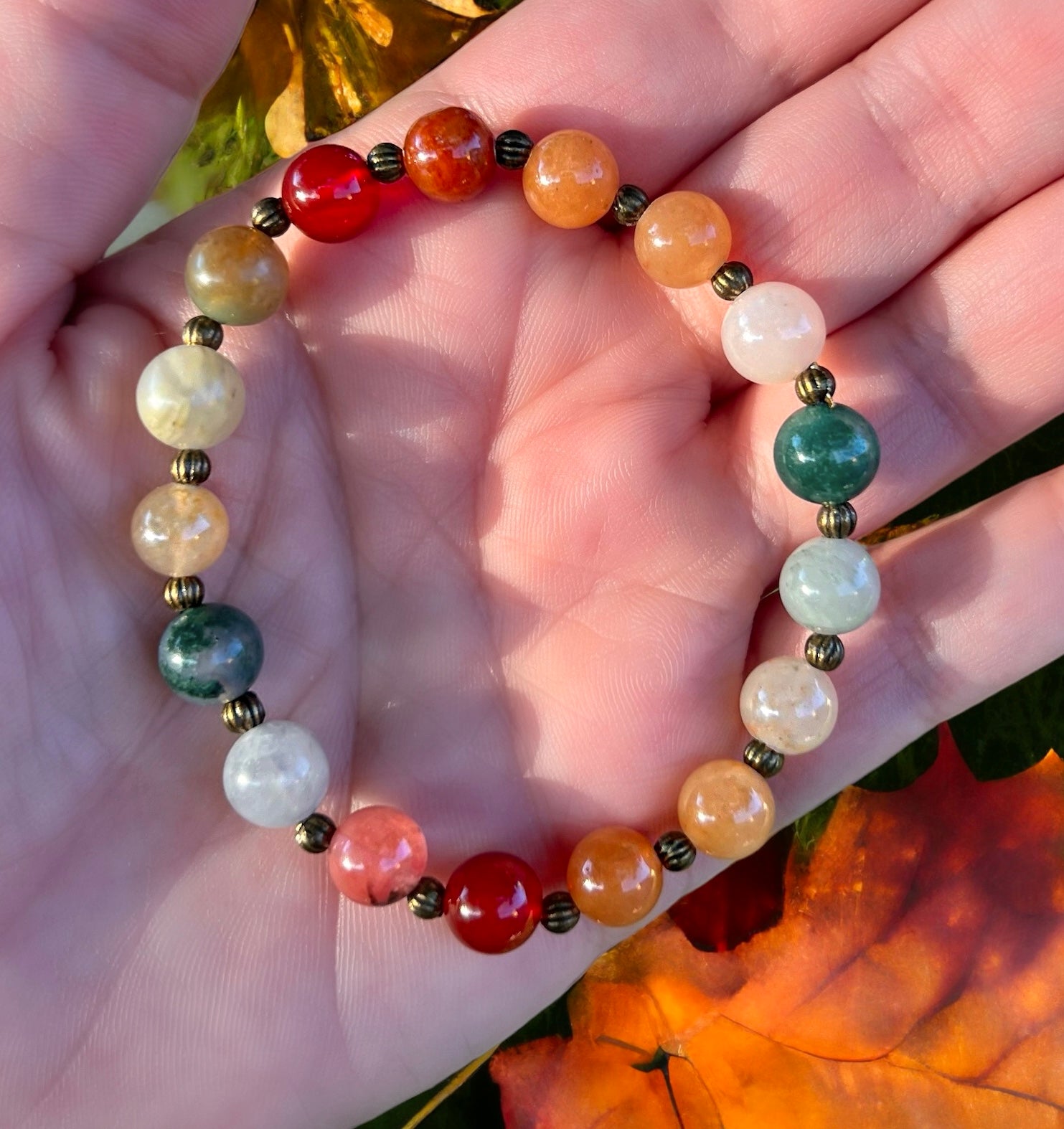 Featuring Moss Agate, Carnelian, Red and Orange Aventurine, and Pink Tourmaline, each bead is paired with rustic vintage spacers for a warm, seasonal look. Moss Agate is believed to encourage abundance and stability, while Carnelian boosts motivation, creativity, and vitality. Aventurine brings luck, fortune, and new opportunities, with Red Aventurine celebrating passion and positive energy. Pink Tourmaline adds a touch of compassion, self-love, and emotional healing. Each bracelet is one-of-a-kind, following the same color flow for a truly unique piece of fall jewelry.