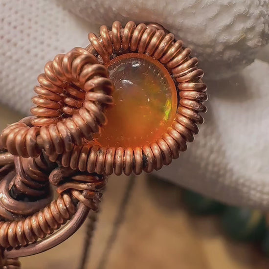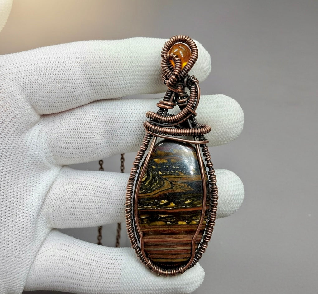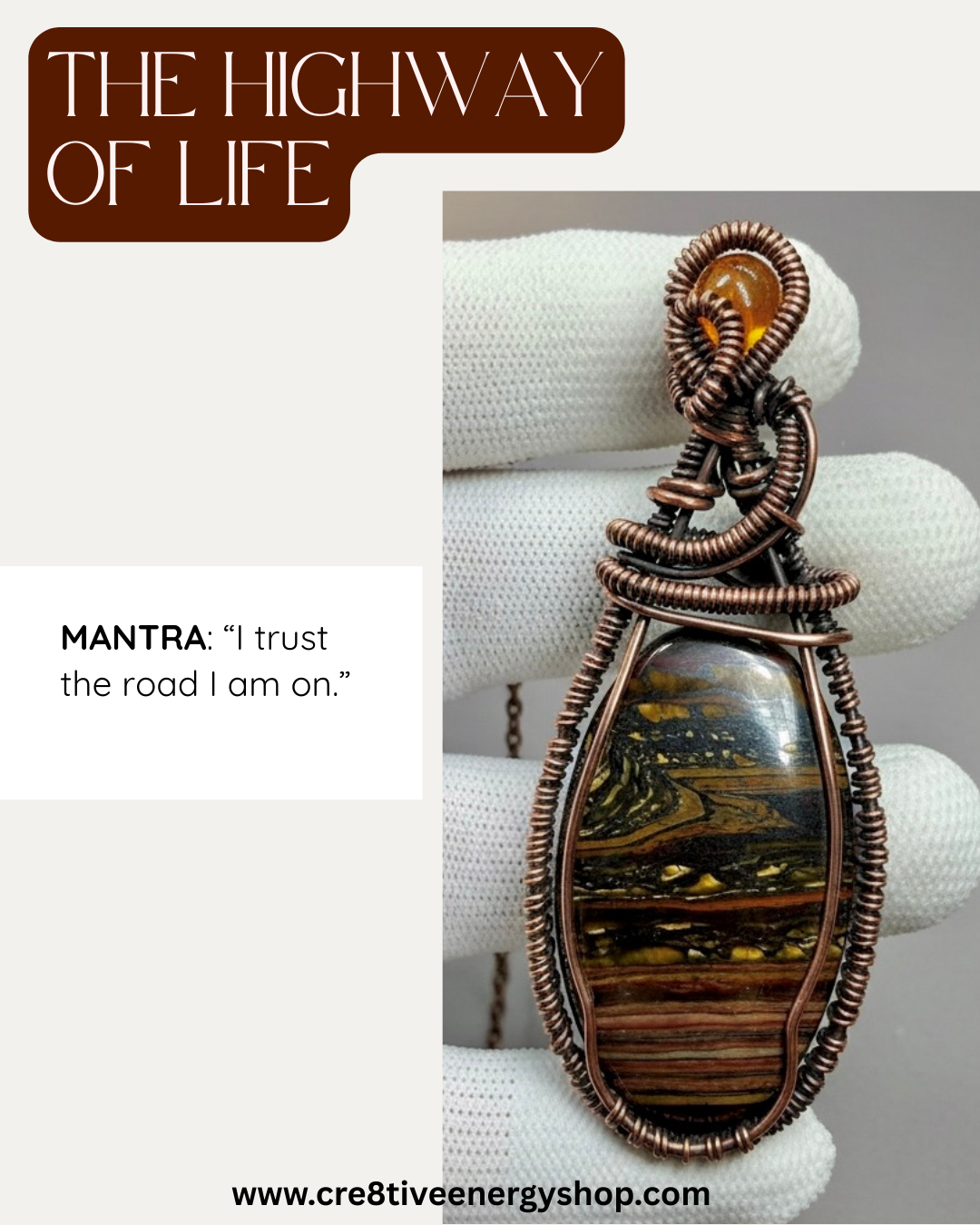 Crowned above the journey sits a Mexican Fire Opal, glowing like an inner flame. It symbolizes passion, creativity, and the spark that keeps us moving forward even when the road feels long and hard. Together, these stones balance earth and fire, foundation and motion, stability and inspiration.