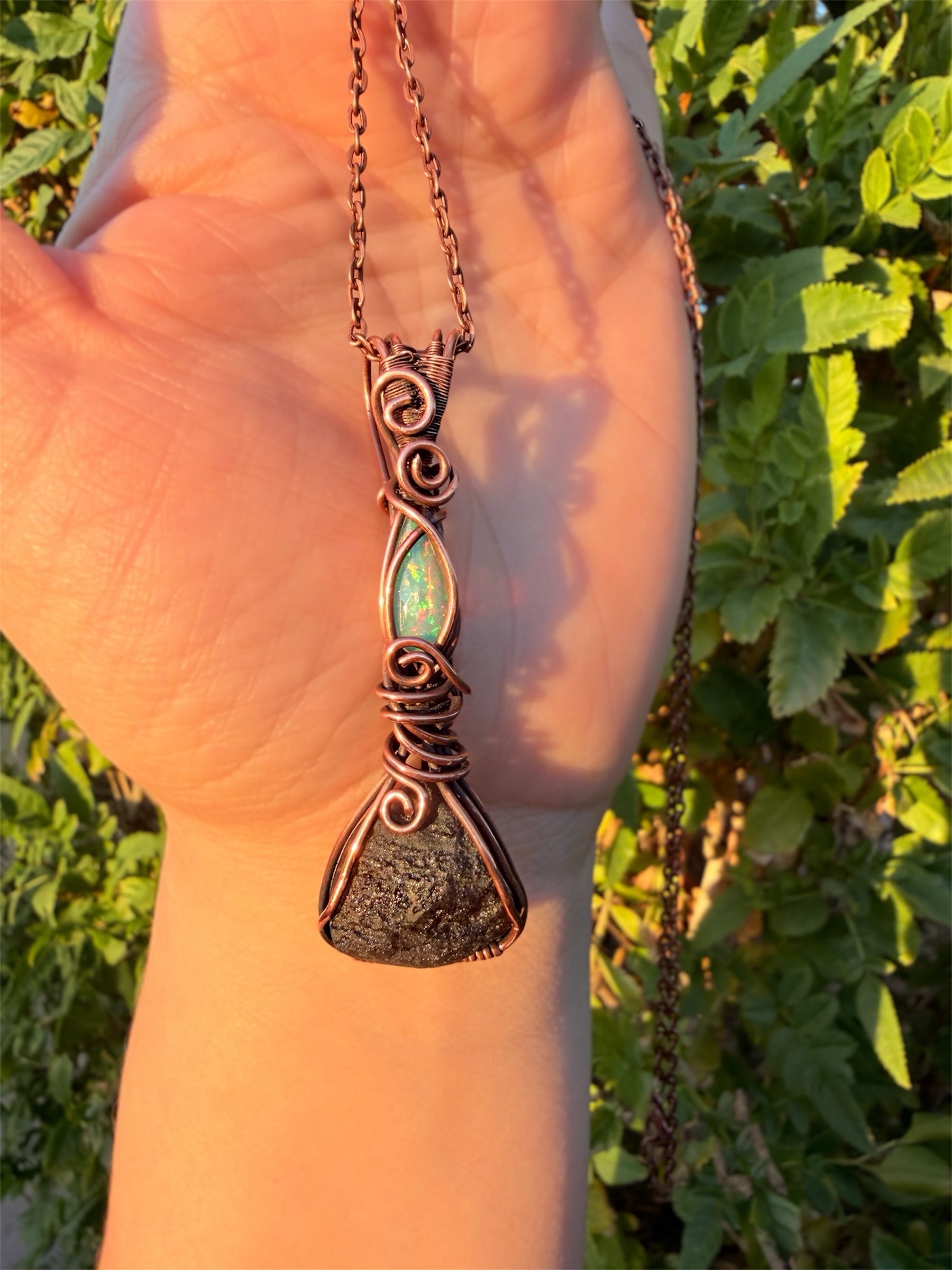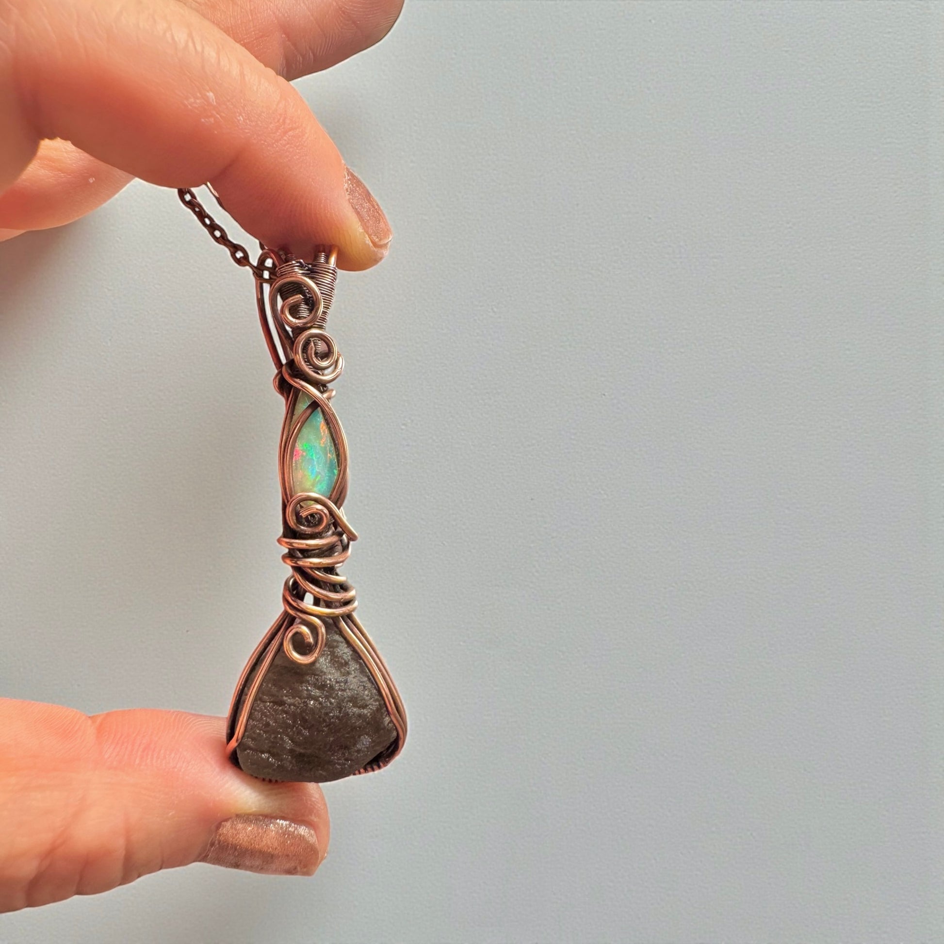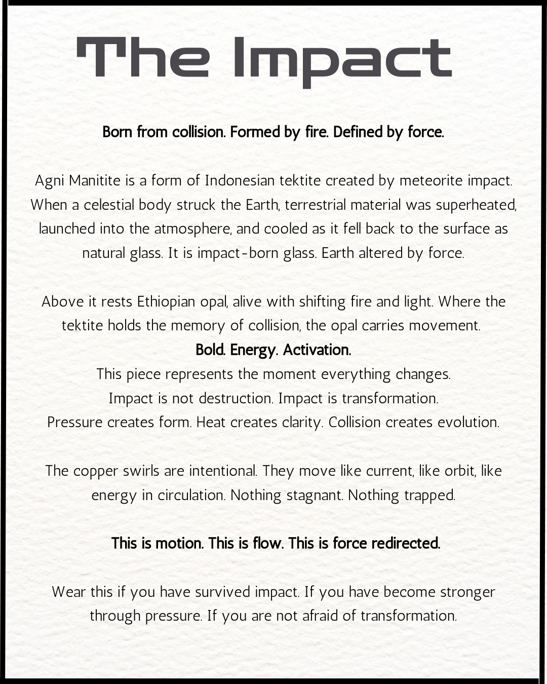 Above it rests Ethiopian opal, alive with shifting fire and light. Where the tektite holds the memory of collision, the opal carries movement.