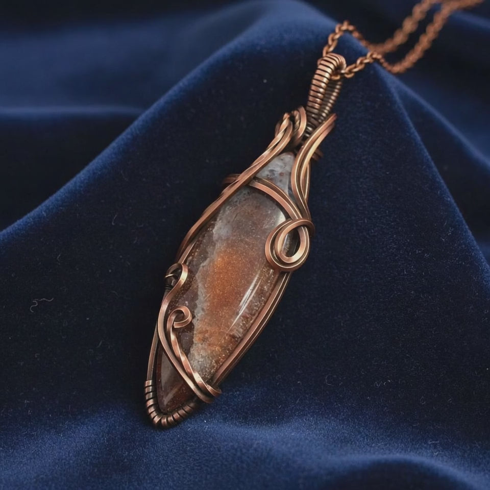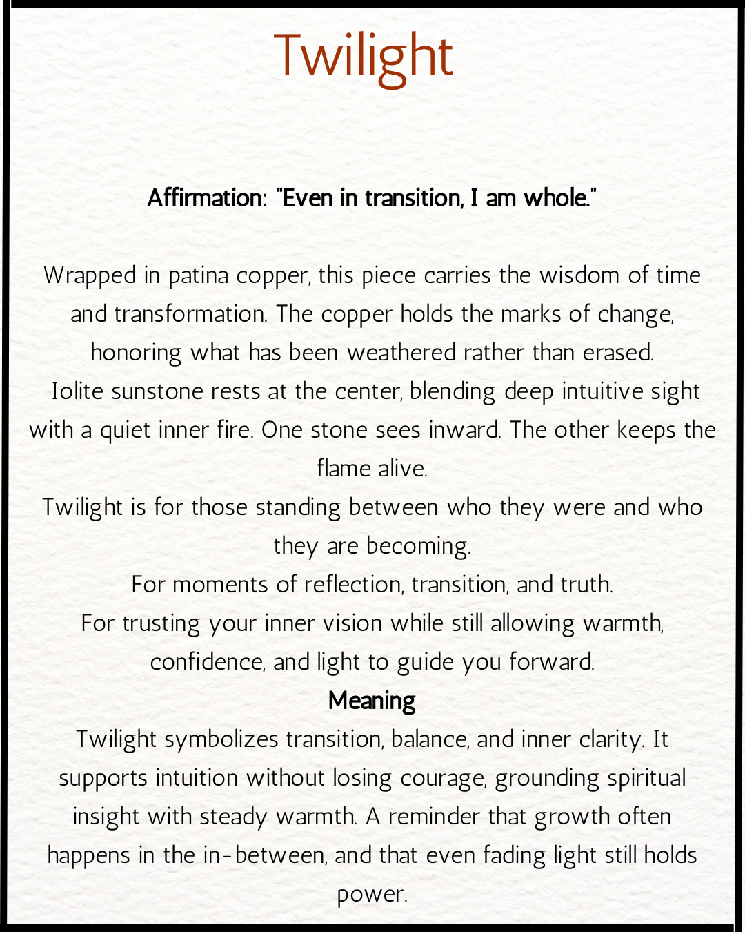 Wrapped in patina copper, this piece carries the wisdom of time and transformation. The copper holds the marks of change, honoring what has been weathered rather than erased. Iolite sunstone rests at the center, blending deep intuitive sight with a quiet inner fire. One stone sees inward. The other keeps the flame alive.