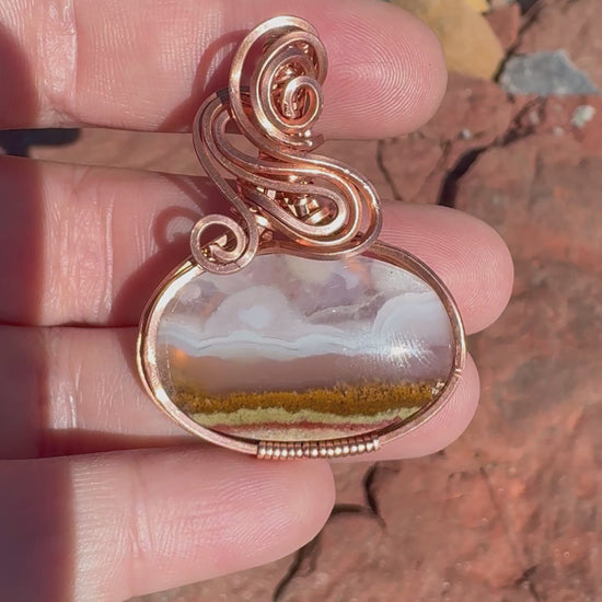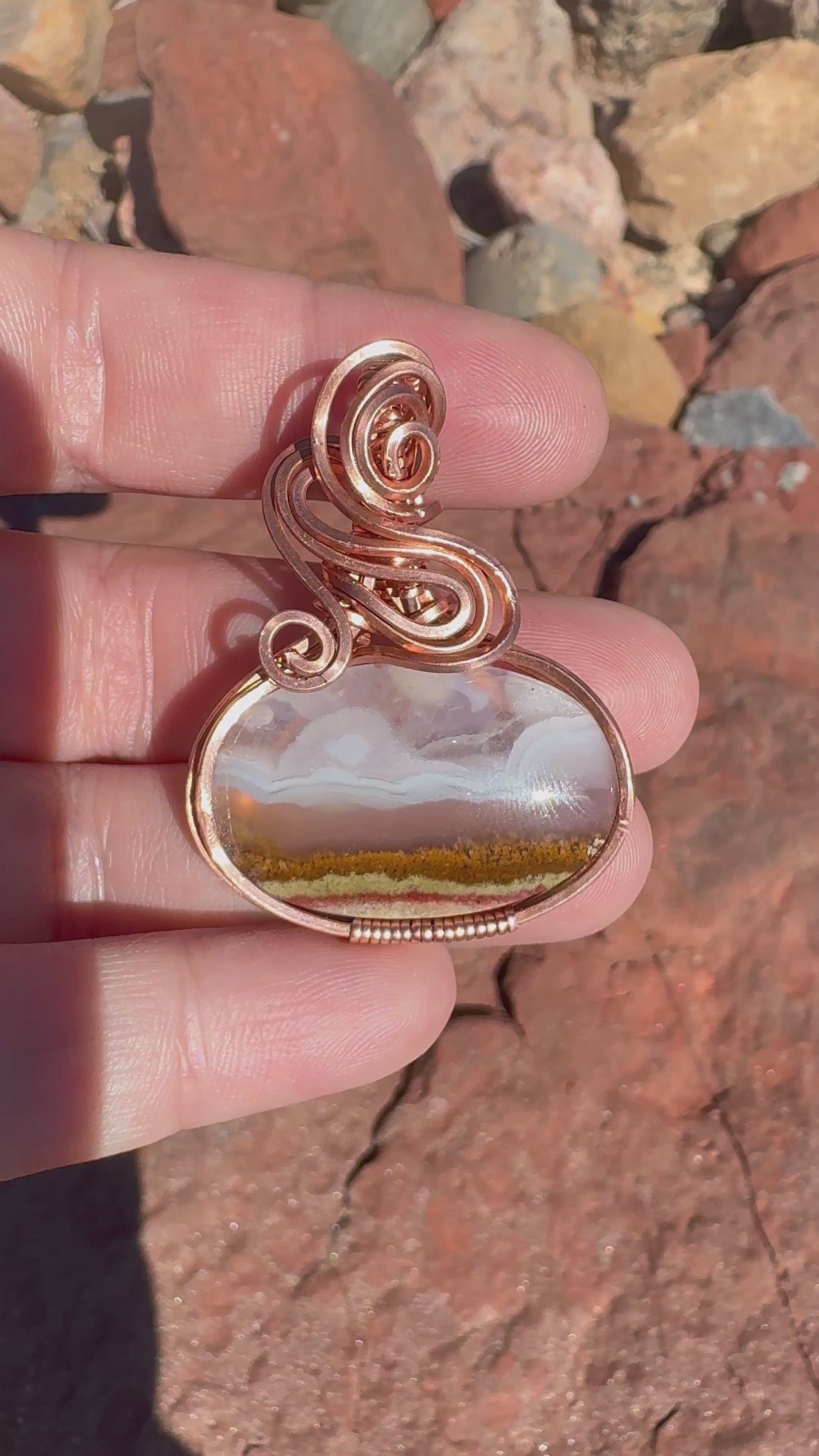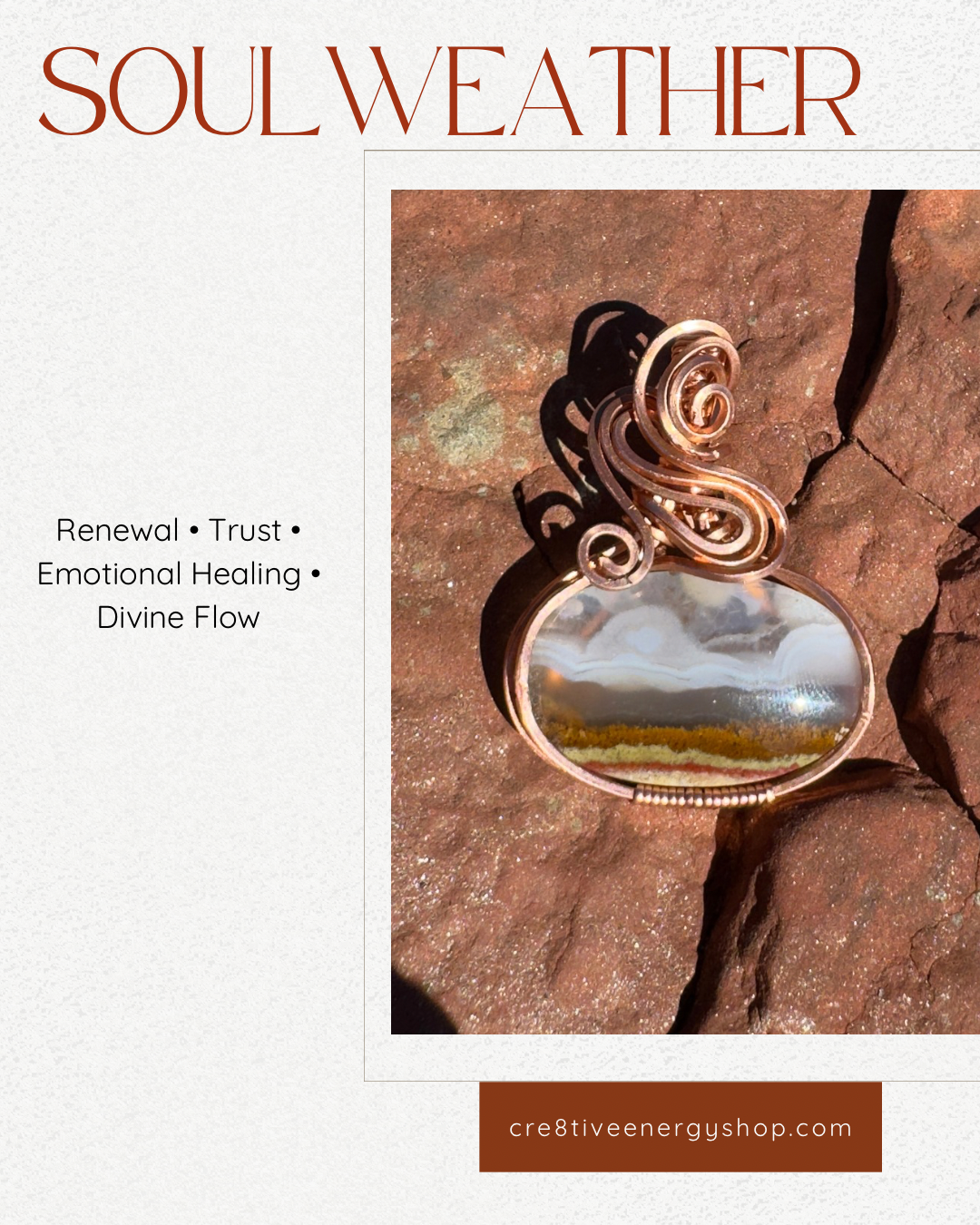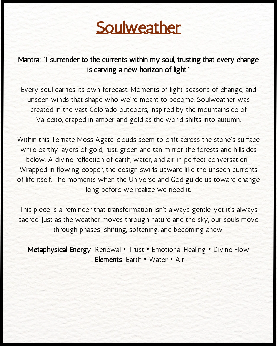 Within this Ternate Moss Agate, clouds seem to drift across the stone’s surface while earthy layers of gold, rust, green and tan mirror the forests and hillsides below. A divine reflection of earth, water, and air in perfect conversation. Wrapped in flowing copper, the design swirls upward like the unseen currents of life itself. The moments when the Universe and God guide us toward change long before we realize we need it.